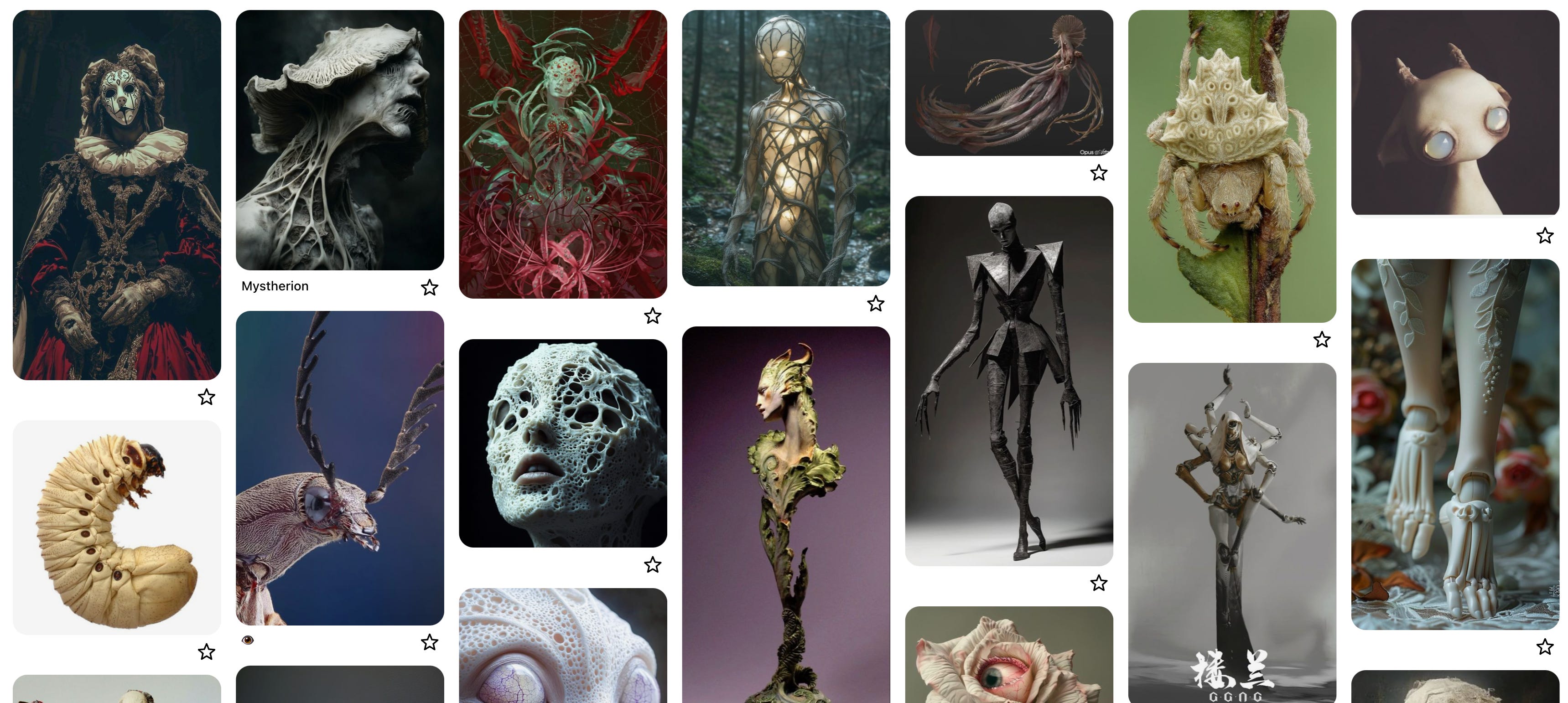Many images depict creatures that are a blend of human and insect or other animals. This suggests themes of metamorphosis, duality, and the blurring of boundaries between species.